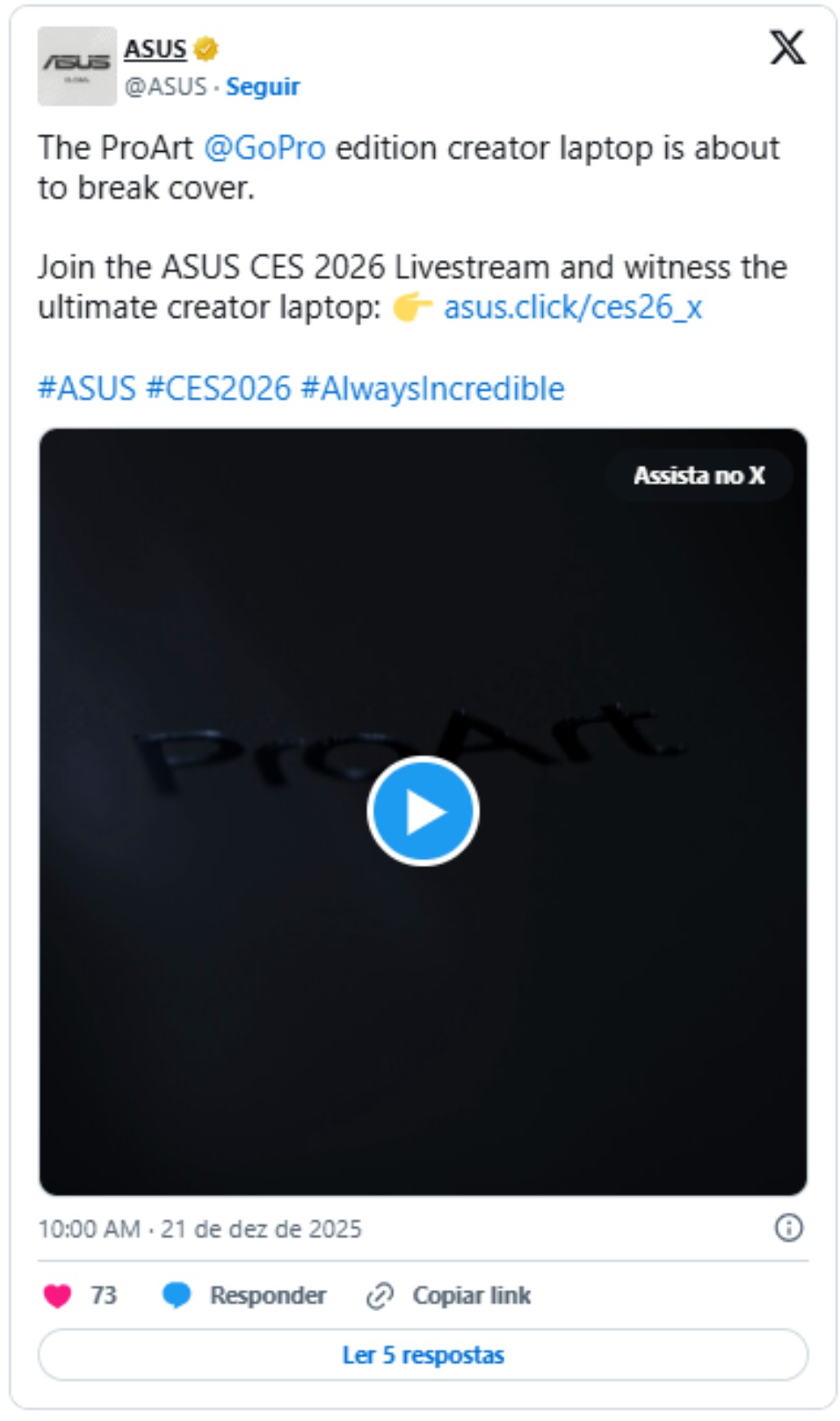 A ASUS confirmou oficialmente que vai apresentar um novo notebook voltado para criadores de conteúdo durante a CES 2026. O modelo se chama ProArt GoPro Edition e será revelado no dia 6 de janeiro, durante a transmissão oficial da marca no evento.