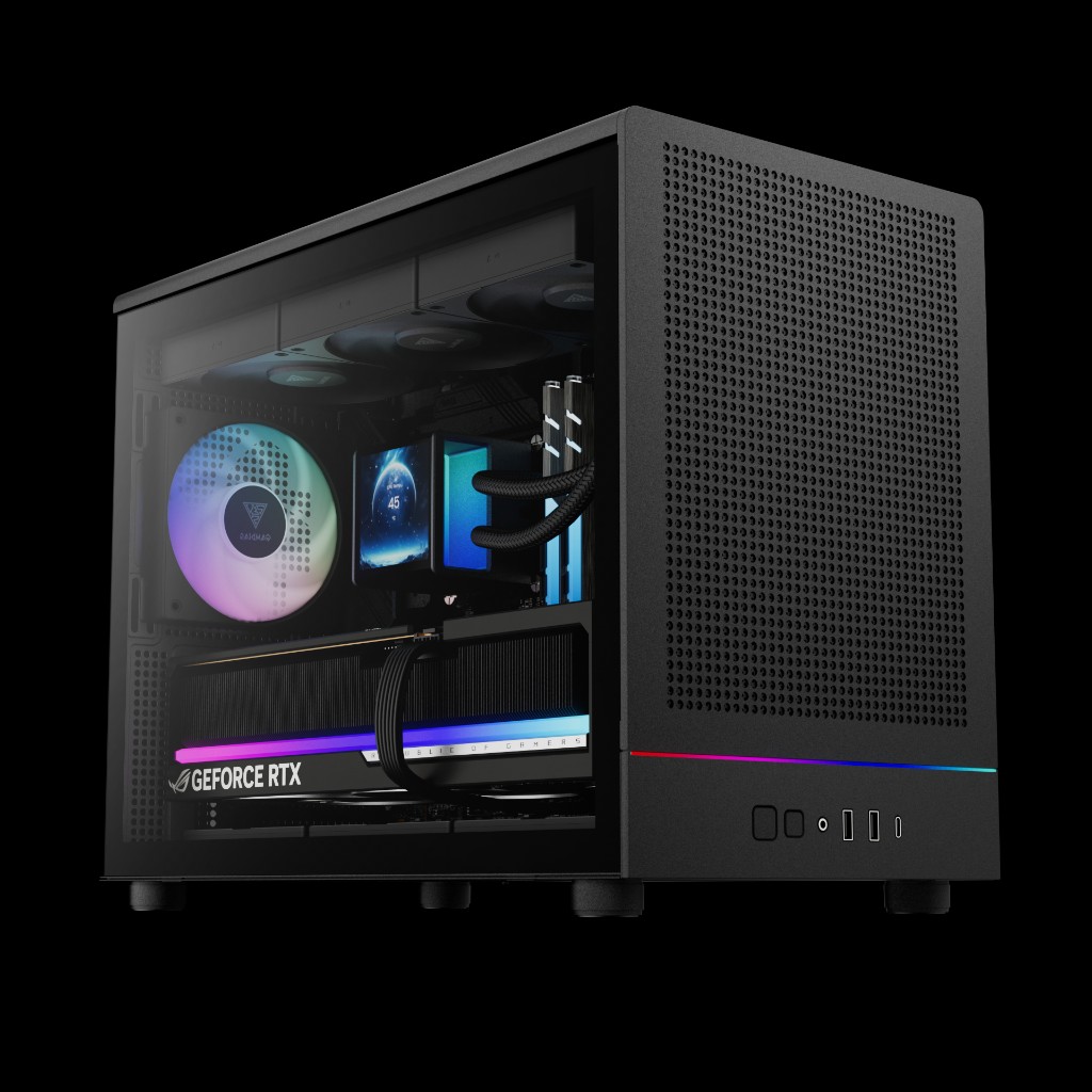 O layout interno prioriza eficiência térmica e opções flexíveis de montagem para quem precisa de desempenho em um formato reduzido.