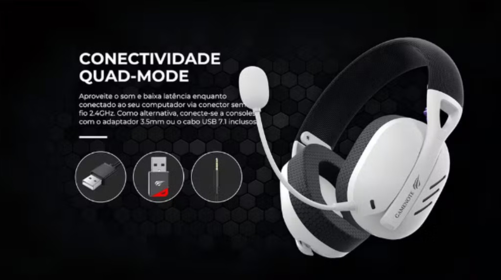 | Conectividade | Receptor de 2,4 GHz, USB, Bluetooth e 3,5 mm (P2) |