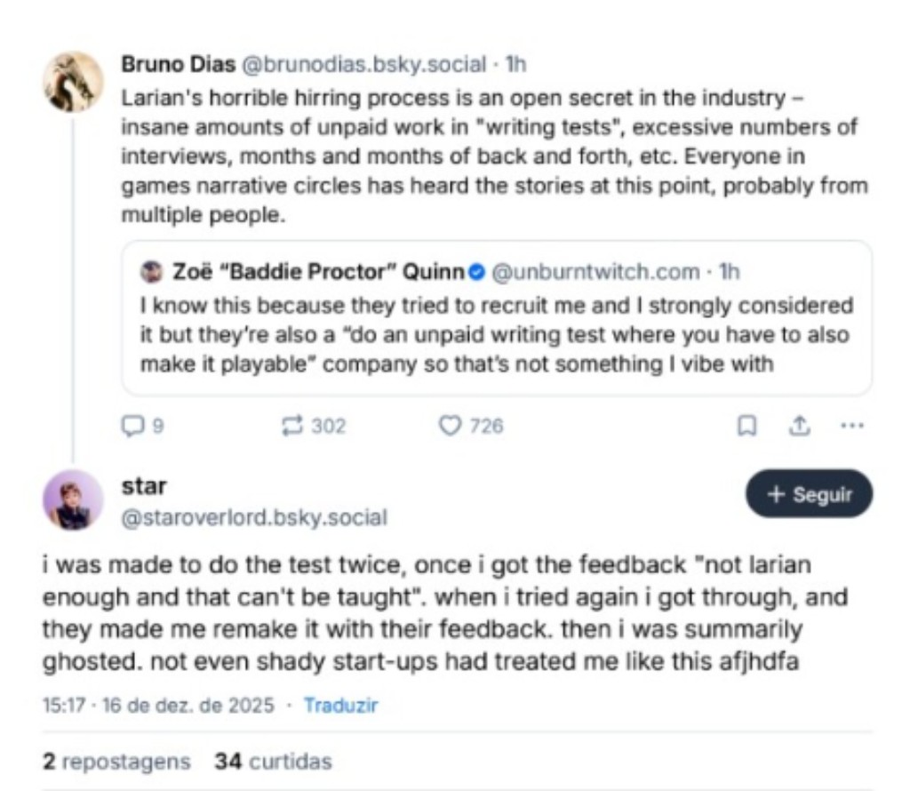 A polêmica com IA acabou abrindo espaço para que desenvolvedores e roteiristas começassem a relatar experiências negativas com os processos seletivos da Larian.