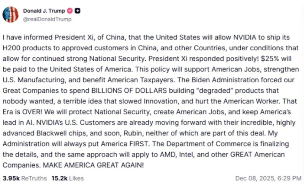 O anúncio foi feito pelo presidente Donald Trump em uma publicação na Truth Social, destacando que o acordo segue critérios “necessários para manter a Segurança Nacional”. A decisão se tornou pública ao mesmo tempo em que o governo reafirmou que os chips Blackwell, considerados os mais poderosos já desenvolvidos pela NVIDIA, continuam vetados na China.
