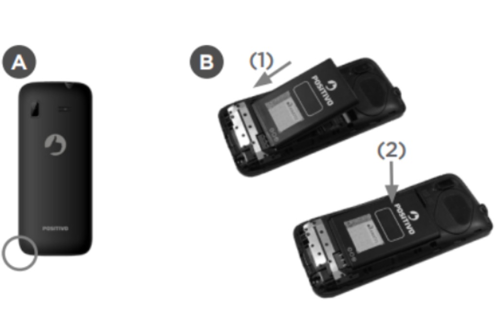 . Para retirar a tampa é necessário puxá-la através do chanfro no canto inferior esquerdo e posteriormente desencaixar os demais cantos. Faça com que a tampa se solte do aparelho aos poucos. B. Com um movimento de cima para baixo (1), coloque os contatos metálicos da bateria alinhados com os contatos metálicos do compartimento e então pressione a parte superior da bateria (2), junto ao compartimento até que haja um encaixe. Para finalizar, recoloque a tampa do aparelho, pressionando novamente os quatro cantos.