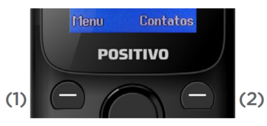 Utilize as teclas de opções para acessar funções conforme indicadas nos cantos inferiores da tela. Por exemplo, aperte a tecla de opções esquerda (1) para acessar “Menu” ou aperte a tecla de opções direita (2) para acessar “Contatos”: Utilize as teclas de navegação para navegar entre as opções de uma ferramenta ou menu, pressionando para cima, baixo, esquerda ou direita. Pressione no centro da tecla de navegação para entrar ou confirmar (tecla OK):