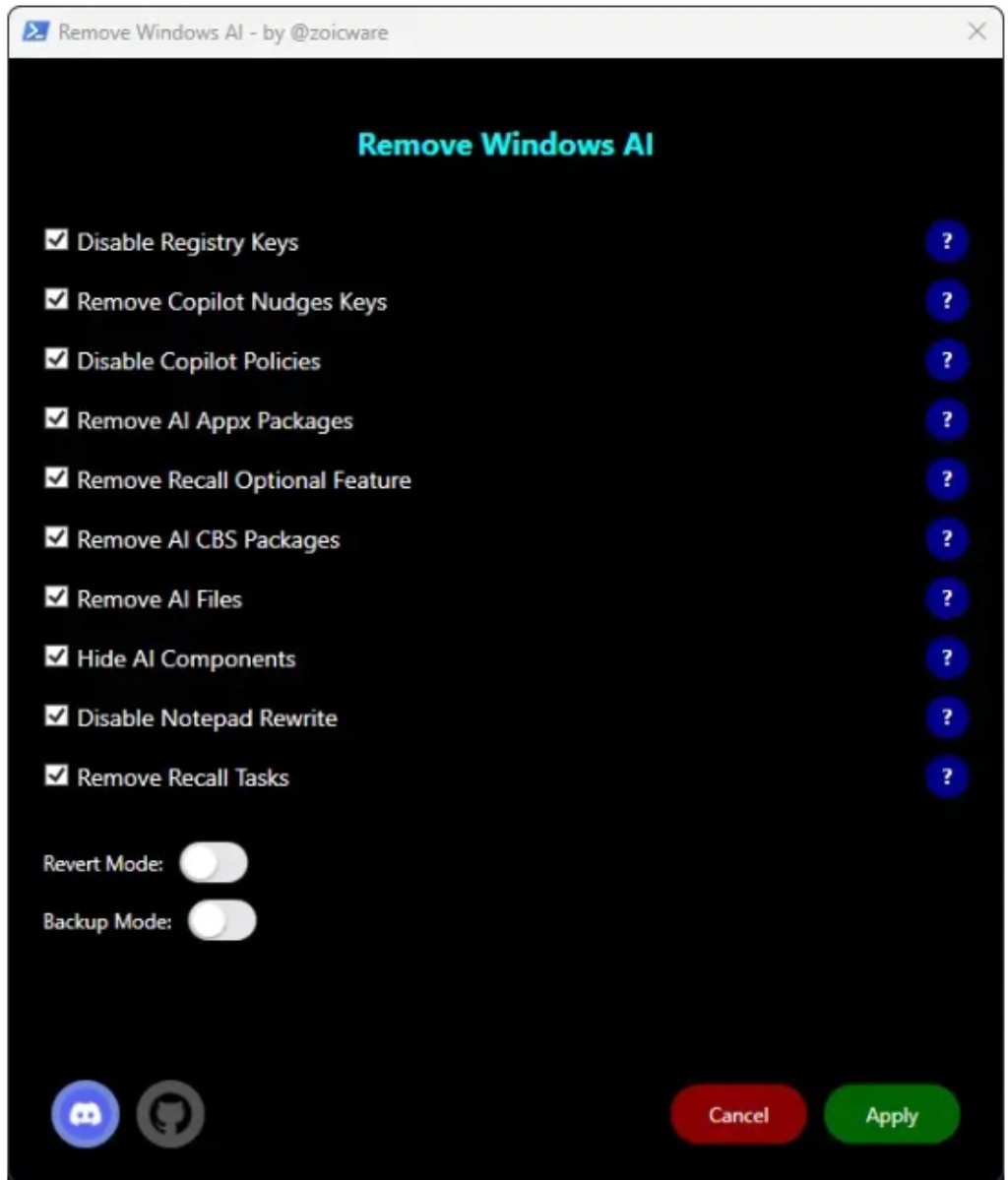Essa abordagem visual torna o processo menos técnico, permitindo que até usuários sem experiência possam configurar seu sistema. Após selecionar os itens, basta aplicar as mudanças — o script cuida do restante. O RemoveWindowsAI também traz opções para reverter as alterações e um modo de backup, para que o usuário não perca a configuração original do Windows 11.