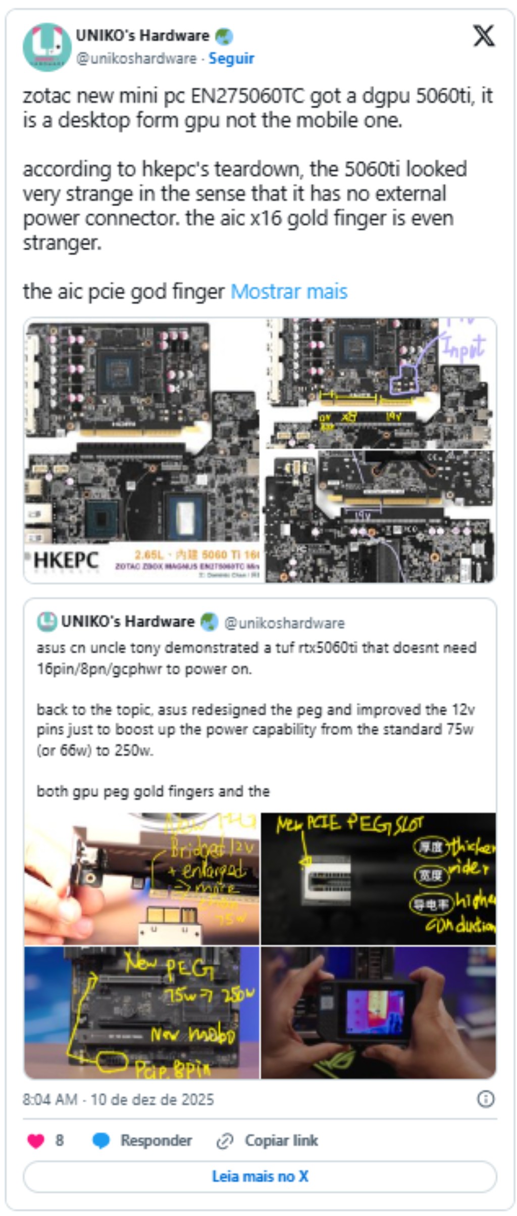 Uma RTX 5060 Ti sem conector 8-pin parece impossível, mas não é mais. A ZOTAC apresentou um método totalmente diferente do que o mercado está acostumado, criando uma solução capaz de alimentar uma placa de vídeo de desktop apenas pelo próprio slot PCIe — algo que, até então, ninguém havia colocado em prática dessa forma no segmento de mini PCs de alto desempenho.