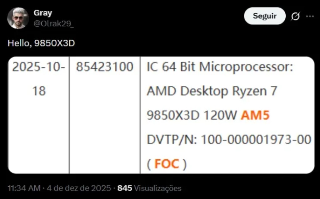 Um novo vazamento trouxe mais fogo às expectativas em torno do Ryzen 7 9850X3D. Desta vez, um manifesto de transporte de outubro listou o processador para soquete AM5 com 120W de TDP — exatamente o mesmo valor do atual 9800X3D. Isso é relevante porque indica que a AMD pode entregar clocks maiores sem exigir alterações nas configurações de energia ou nos sistemas de refrigeração já adotados por usuários do 9800X3D. Em outras palavras: mais desempenho, sem precisar redesenhar seu PC.