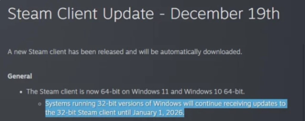 A Valve foi clara no comunicado exibido no próprio cliente Steam. O suporte para Windows 10 32-bit será encerrado em 1º de janeiro de 2026.
