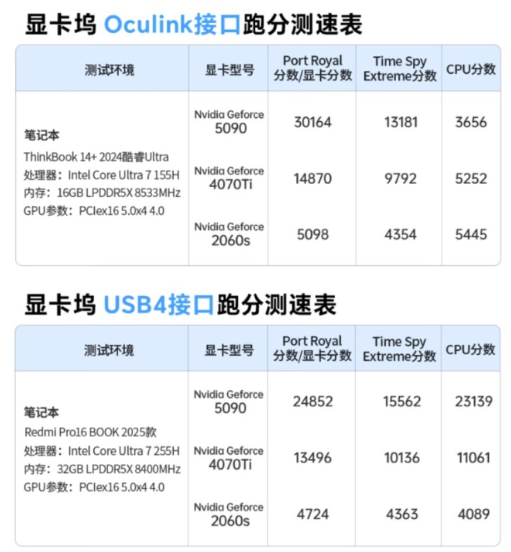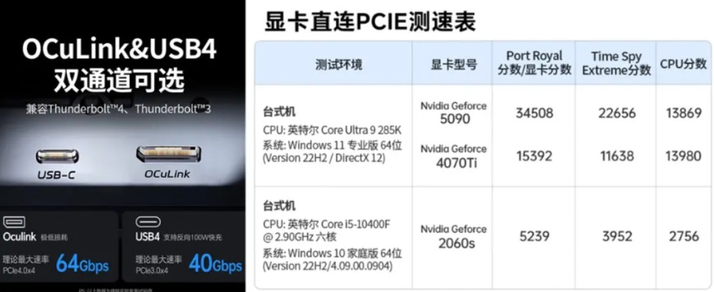 - OCuLink — até 64Gbps, oferecendo desempenho quase idêntico ao de um desktop.
