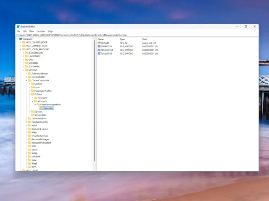 reg add HKEY_LOCAL_MACHINE\SYSTEM\CurrentControlSet\Policies\Microsoft\FeatureManagement\Overrides /v 735209102 /t REG_DWORD /d 1 /f reg add HKEY_LOCAL_MACHINE\SYSTEM\CurrentControlSet\Policies\Microsoft\FeatureManagement\Overrides /v 1853569164 /t REG_DWORD /d 1 /f reg add HKEY_LOCAL_MACHINE\SYSTEM\CurrentControlSet\Policies\Microsoft\FeatureManagement\Overrides /v 156965516 /t REG_DWORD /d 1 /f