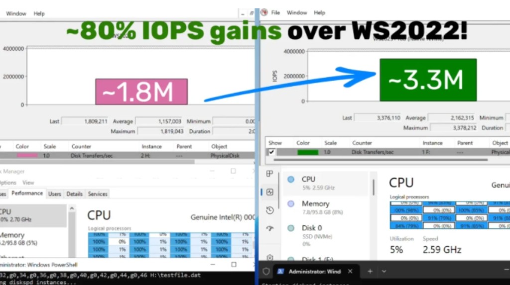 Quando a Microsoft apresentou o roadmap do Windows Server 2025, a estimativa inicial era de um ganho em torno de 70% em IOPS. No entanto, os testes finais e dados de produção revelaram resultados ainda melhores, alcançando aproximadamente 80% de aumento nas operações de entrada e saída por segundo.